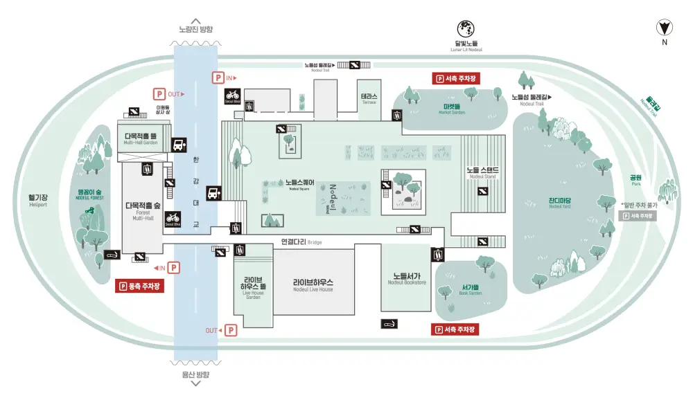 노들섬 주차장은 동측주차장과 서측주차장이 있습니다. 노들섬 내 주차장에는 주차공간이 많지 않기 때문에 주차장 이용 전 실시간 주차장 현황을 통해 주차 가능 여부를 확인하시면 편하게 이용이 가능합니다.