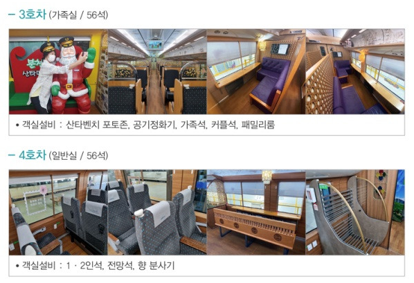 동해산타열차는 코레일 홈페이지와 코레일톡 앱에서 예매할 수 있으며, 동해산타열차 가족석과 동해산타열차 패밀리룸은 최소 4인 이상, 동해산타열차 커플석은 2인으로 예약이 가능합니다.