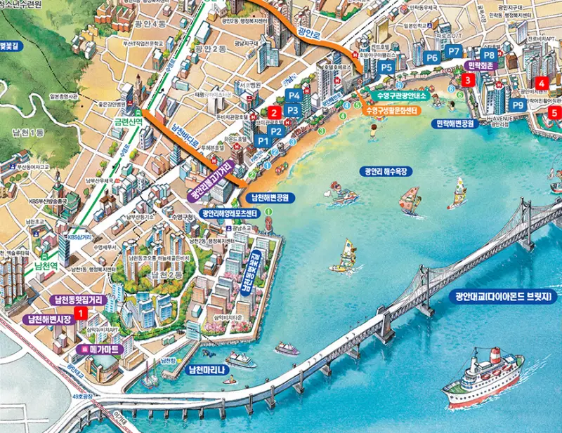 광안리해수욕장 주차장은 공영주차장과 민영주차장이 있습니다. 빨간색 1번부터 5번까지 광안리해수욕장 공영주차장의 위치이며, P1부터 P9까지는 민영주차장 위치입니다.
