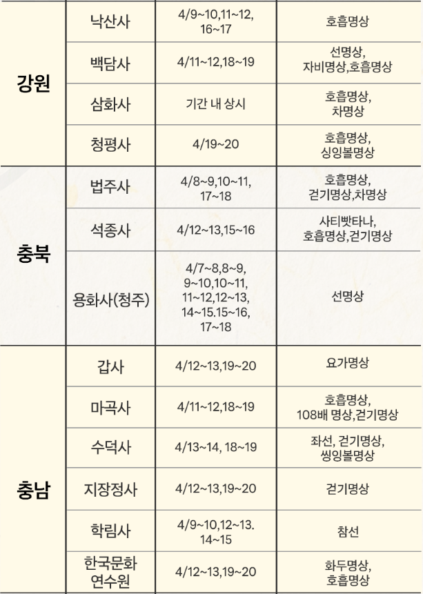 | 화계사 | 4월 12일~13일, 4월 15일~16일, 4월 22일~23일 | 사띠빳타나, 호흡명상, 숲명상 |