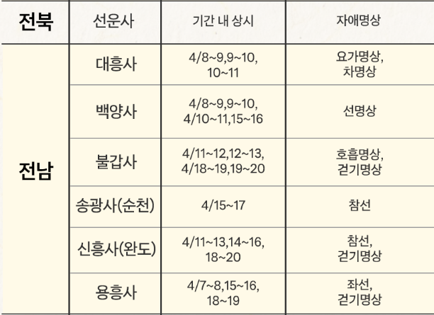 | 연등국제선원 | 4월 10일~11일, 4월 11일~12일, 4월 13일~14일, 4월 16일~17일, 4월 17일~18일 | 선명상, 걷기영상 |