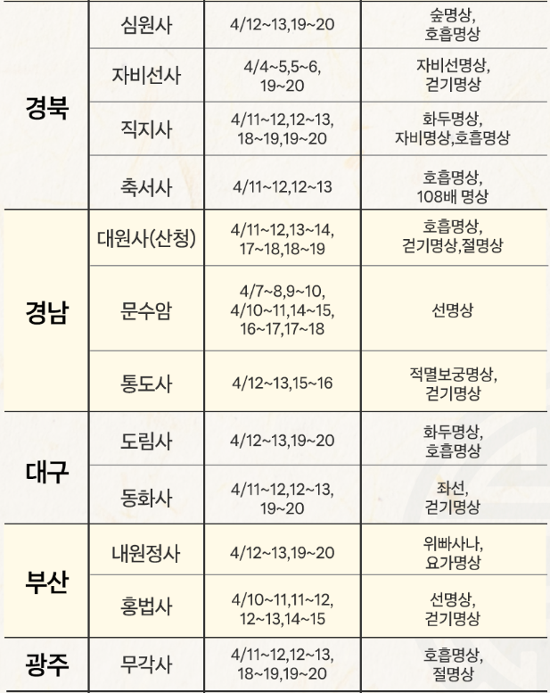 | 법륜사 | 4월 9일~10일, 5월 15일~17일 | 호흡명상, 절명상, 차명사 |
