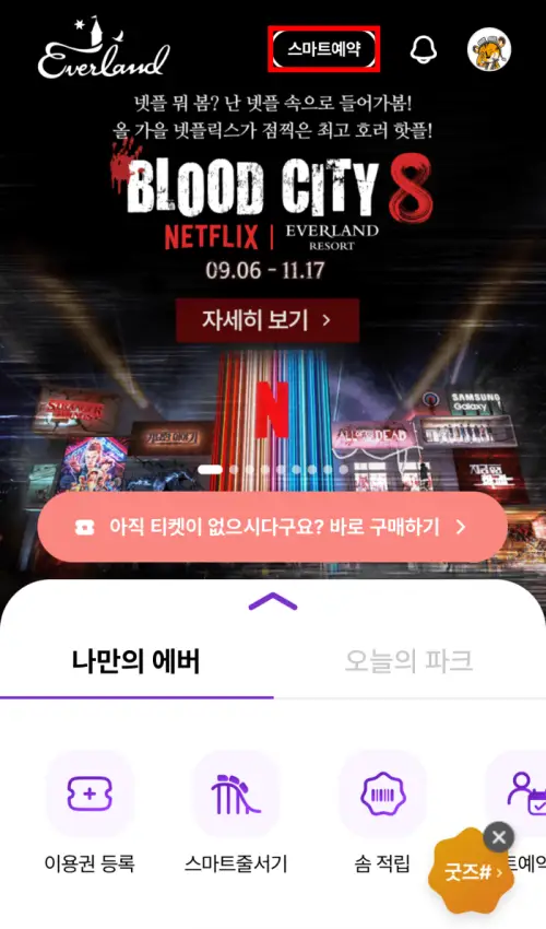 1. 에버랜드 앱을 실행하여 로그인 후 상단 스마트 예약을 클릭합니다.
