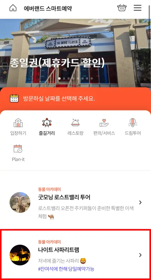 3. 즐길거리 체험 중 나이트 사파리트램을 선택합니다.