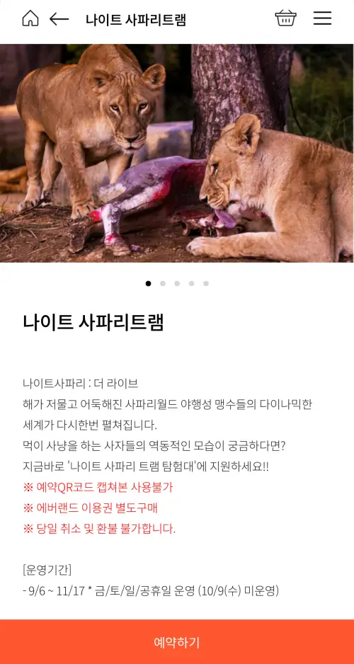 에버랜드 나이트 사파리는 트램을 타고 야행성 맹수들을 만날 수 있는 체험 프로그램으로 에버랜드에서도 인기가 좋습니다. 나이트 사파리는 9월부터 11월까지 약 3개월만 운영하기 때문에 빠르게 예매하시기 권해드립니다. 아래에서 에버랜드 나이트 사파리 예약방법과 꿀팁까지 알려드리겠습니다.