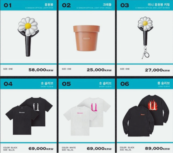 지드래곤 전시회에서는 전시 한정 굿즈도 판매할 예정입니다. 특히 지드래곤을 상징하는 데이지 꽃모양의 응원봉을 출시하여 팬들의 큰 관심을 모으고 있습니다. 응원봉은 1인당 2개 구매제한과 크래들과 응원봉 키링은 1인당 1개 구매제한이 있습니다.