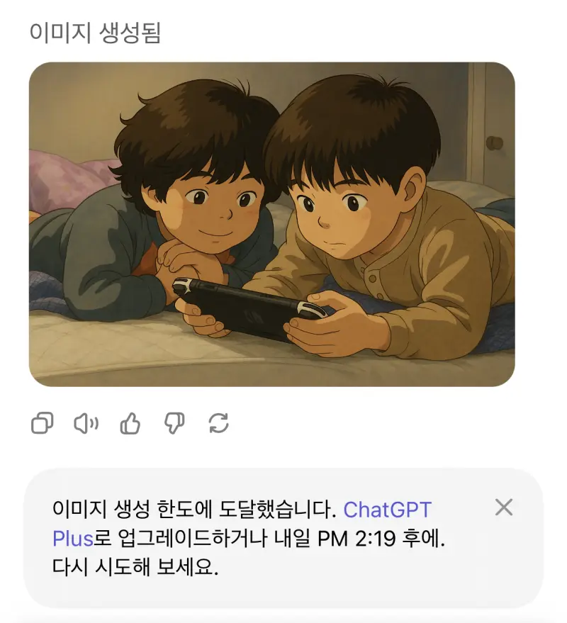 챗GPT 지브리 스타일 이미지 생성은 GPT-4 버전에서 가능합니다. 무료 사용자는 하루 사용할 수 있는 횟수가 2~3장으로 제한되며, 이미지 생성까지 5분 이상 시간이 소요됩니다.