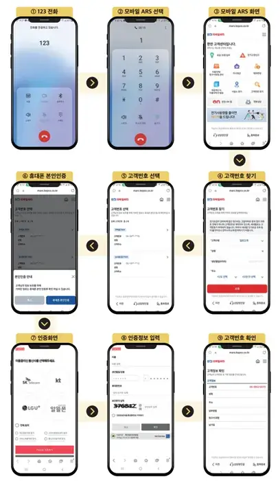 한전 고객센터 (국번 없이 ☎123)으로 전화 → 1번 (모바일 ARS) 선택 → 모바일 ARS 화면 → 고객번호 찾기 → 고객번호 선택 → 휴대폰 본인인증 → 인증화면 → 인증정보 입력 → 고객번호를 확인할 수 있습니다.
