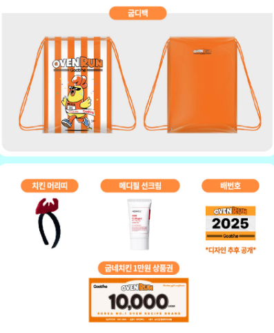 러닝 외에도 다양한 이벤트 및 체험 프로그램, 포토존 등이 마련되며, 참가자 전원에게는 굽네오븐런 참가자분들에게는 기념품(티셔츠, 번호표, 완주 메달 등)과 굽네치킨 1만 원 상품권이 제공됩니다.
