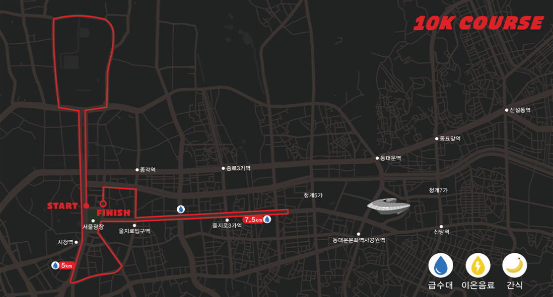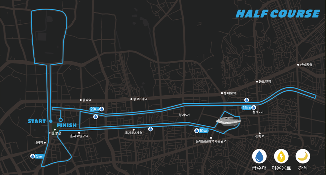 하프 코스는 서울광장을 시작으로 을지로입구, 동대문역사문화공원, 청계천, 한강대로를 지나 동부간선도로까지 이어지는 21.1km의 완주감 높은 루트입니다.