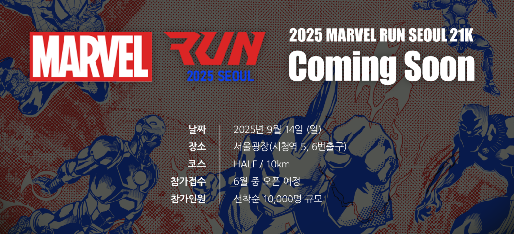 마블 팬이라면 절대 놓칠 수 없는 히어로와 함께 서울을 달리는 2025 마블런 서울이 9월 14일에 서울광장에서 개최됩니다. 2025년 마블런에는 21K 하프코스가 추가되어 총 2개 코스로 진행됩니다. 약 1만 명의 참가자를 선착순으로 모집하기 때문에 2025 마블런 서울 일정, 접수 방법, 코스 등 자세한 내용을 함께 알아보겠습니다.