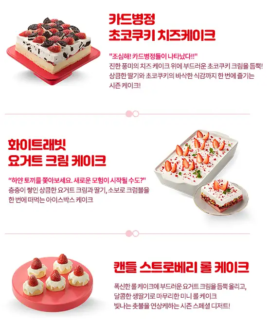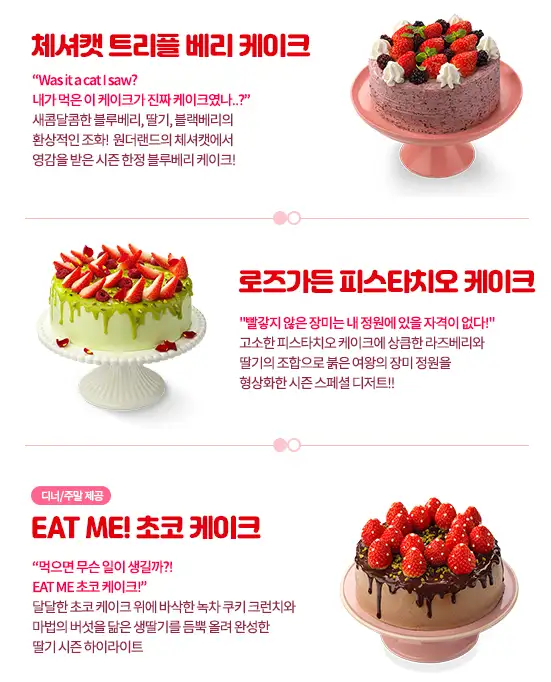 2025 빕스 딸기축제에는 체셔캣 트리플 베리 케이크, 로즈가든 피스타치오 케이크, EAT ME! 초콜릿 케이크, 카드병정 초콜릿쿠키 치즈케이크, 떠먹는 화이트래빗 요구르트 크림 케이크 등 딸기 케이크들이 있습니다.