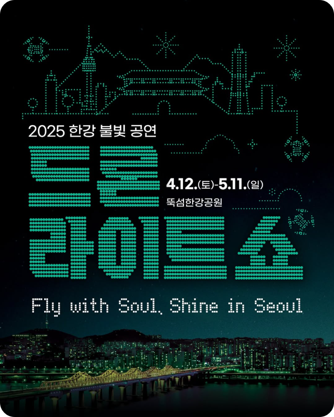 2025 한강 드론쇼는 4월 27일(일)부터 6월 15일(일)까지 뚝섬한강공원에서 5회 진행됩니다. 원래 4월 19일 시작할 예정이었으나 우천 예보로 일정이 일주일 연기 되었습니다.