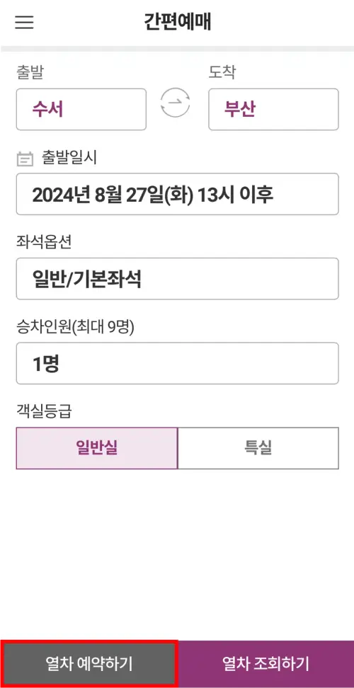 3. 출발지, 도착지, 출발일시 등 확인 후 열차 조회하기를 클릭합니다.