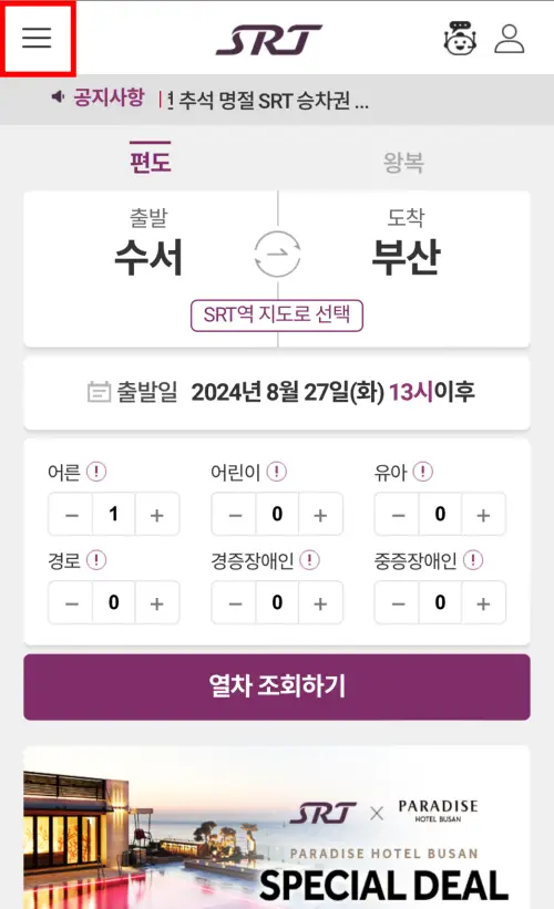 1.SRT 앱을 실행하여 좌측 상단에 있는 메뉴 버튼을 클릭합니다.