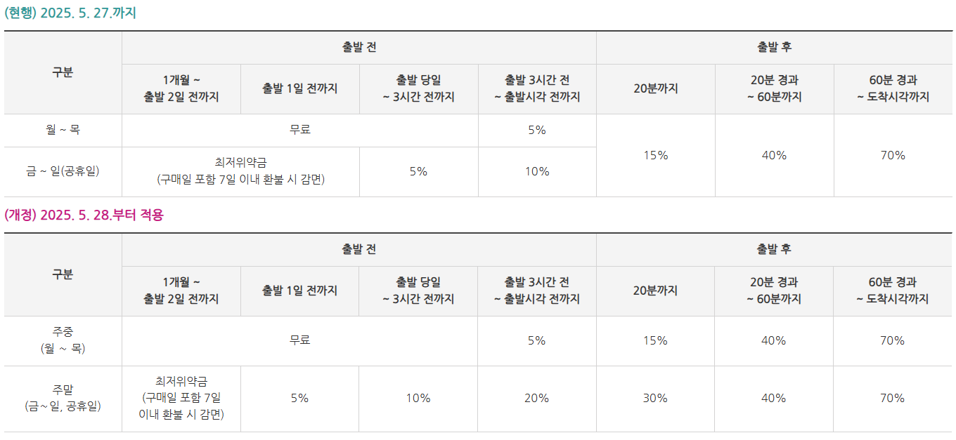 월요일~목요일 열차 승차권은 출발 3시간 전까지 환불할 경우 위약금이 발생하지 않지만 3시간 전에서 출발시각 전까지 환불하면 5%가 발생합니다.