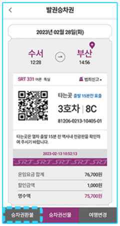 - SRT 앱을 통한 환불 : 발권 완료 후 승차권 확인 > 승차권 하단의 '승차권 환불' 클릭