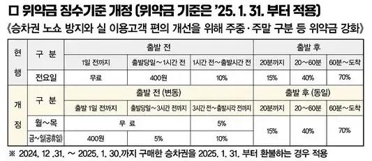 열차 출발 당일 승차권 취소 하는 경우 발생하는 수수료 기준은 출발 전 1시간 전에서 3시간 전으로 변경되었으며, 위약금 기준은 주중과 주말로 구분되어 차등 적용됩니다. 자세한 내용은 아래 표에서 확인하시기 바랍니다.